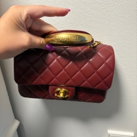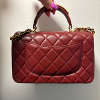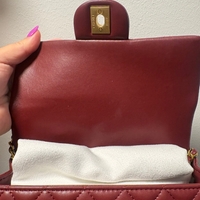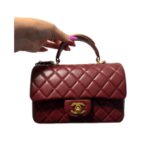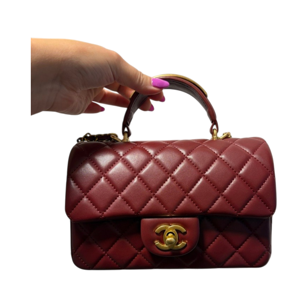 Tummanpunainen tikattu nahkalaukku, kultaiset ketju- ja lukkoyksityiskohdat.