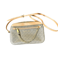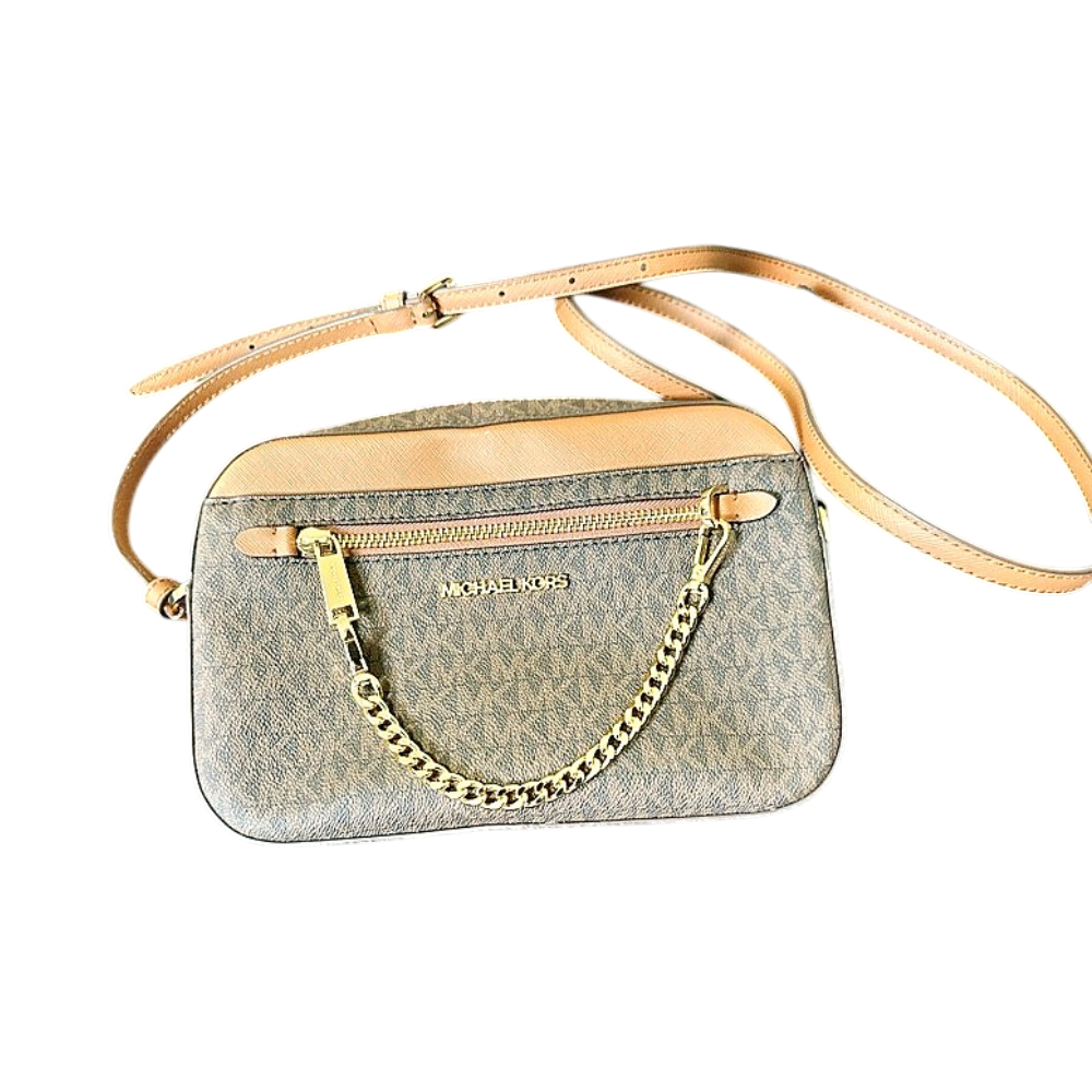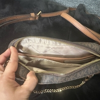 Michael Korsin ruskea olkalaukku kullanvärisillä yksityiskohdilla.