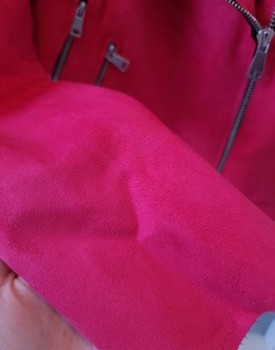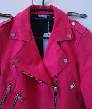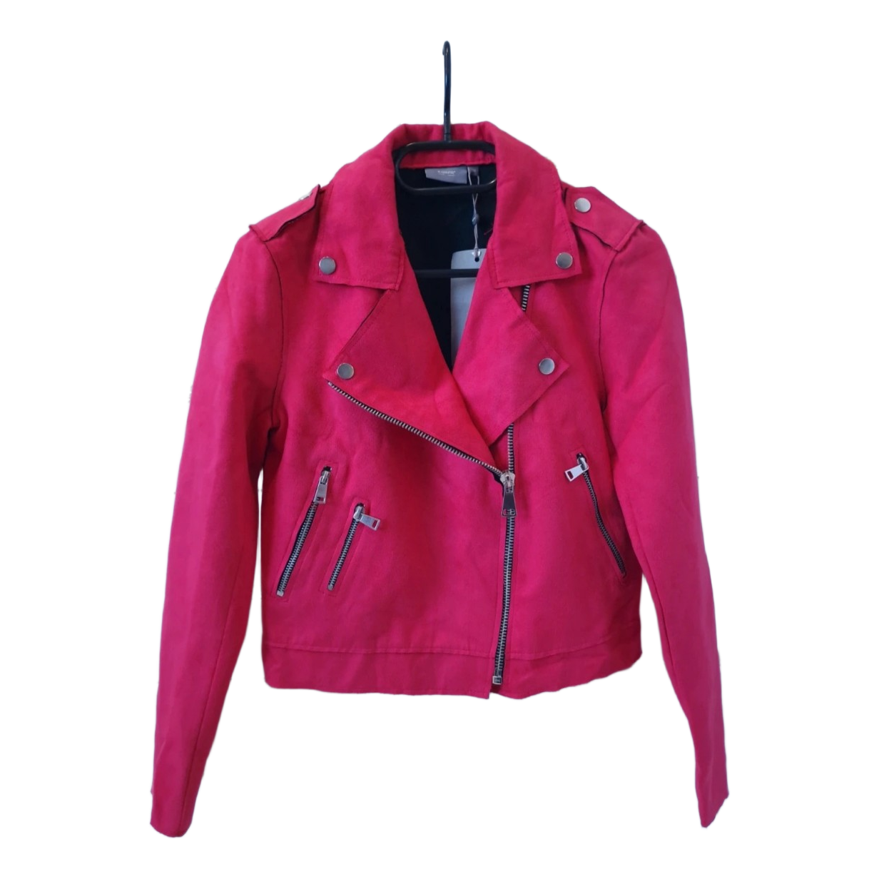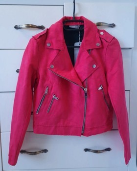 Biker jacket in bright pink. Features front zippers, silver-toned hardware, and a collared neckline. Brand new with tags, size 34.