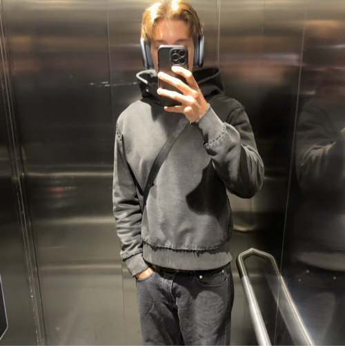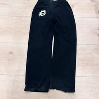 Miesten mustat collegehousut printillä, väljät lahkeet. Ei enää saatavilla