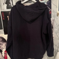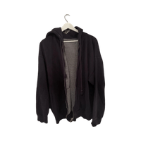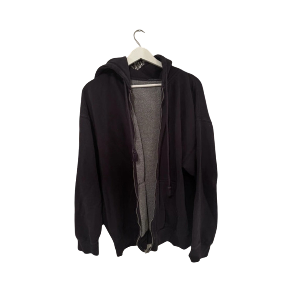 Oversized dark blue zip-up hoodie with drawstring hood, grey lining.