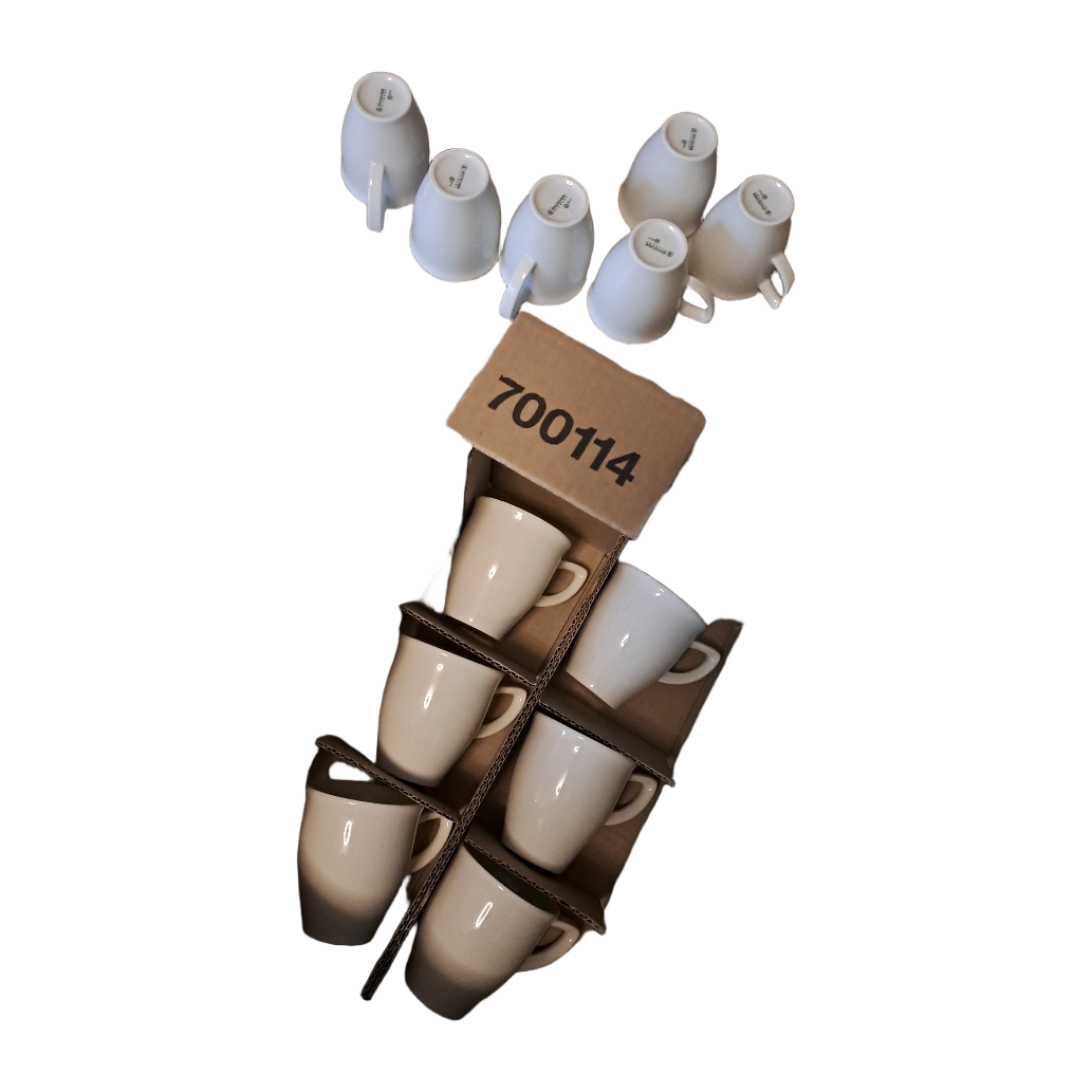 Kuusi valkoista posliinikahvimukia Bauscherilta.Laadukkaat ja kestävät Bauscherin posliinikupit, jotka sopivat erinomaisesti niin kotiin kuin ammattikäyttöön. Ajattoman tyylikäs muotoilu ja kestävä materiaali – saksalaista laatua.