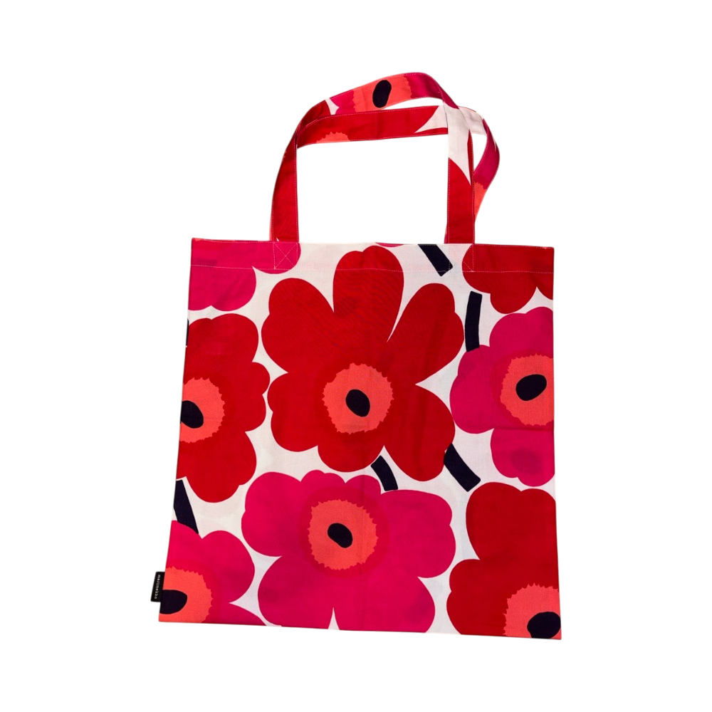 Värikäs puuvillainen kangaskassi Unikko-kuosilla.