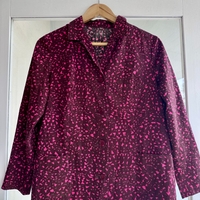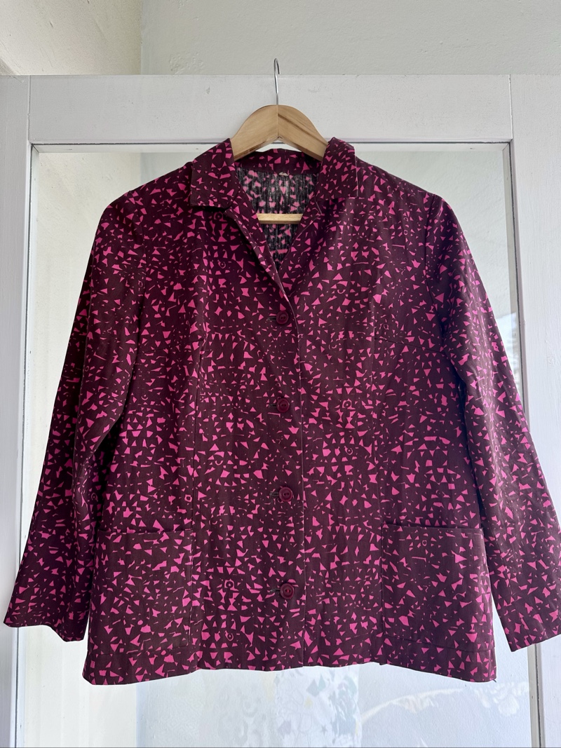 Marimekko violetinsävyinen takki, napit edessä. Puuvillaa. Laput leikattu. Hyväkuntoinen. Koko 40.