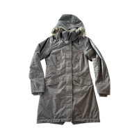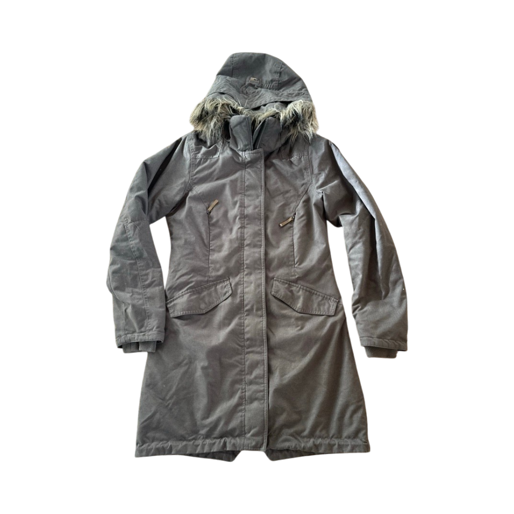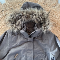 Pitkä naisten talvitakki irrotettavalla huivireunuksella.