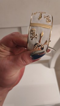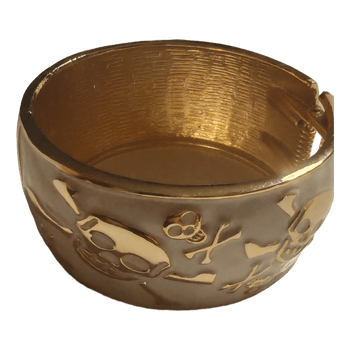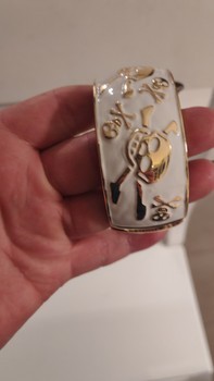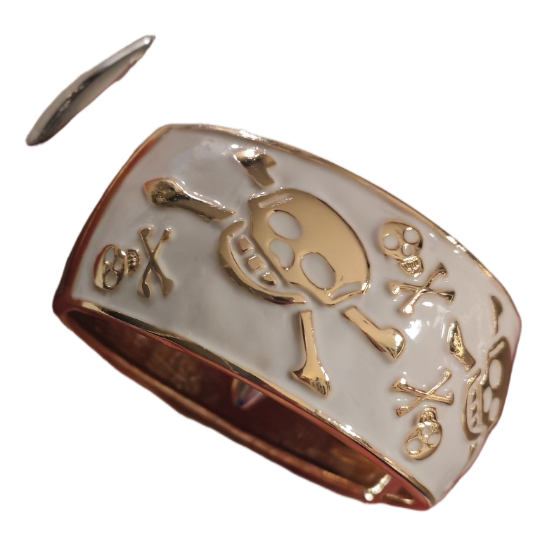 Valkoinen rannerengas, jossa kultaisia pääkallokuvioita. Saranallinen malli.