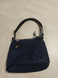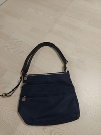 Tilava naisten olkalaukku useilla vetoketjutaskuilla.