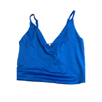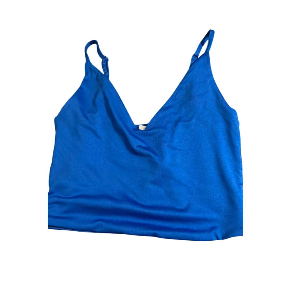 V-kaula-aukollinen sininen hihaton toppi, säädettävät olkaimet.