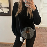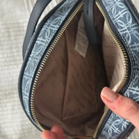 Small monogram crossbody bag with zip closure and adjustable strap.