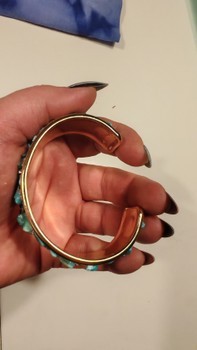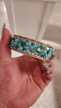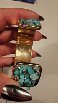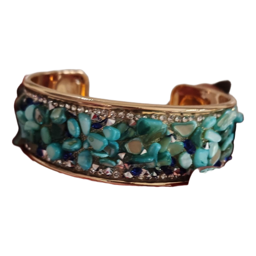 Kultasävyinen, koristeellinen rannekoru, jossa on turkooseja kiviä ja strassiyksityiskohtia.