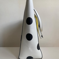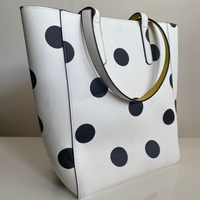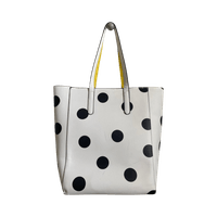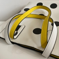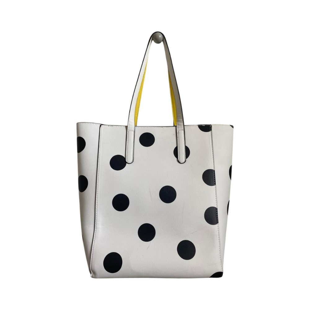 Stradivariuksen laukku, jossa mustia pilkkuja valkoisella pohjalla ja keltaisella sisävuorella.