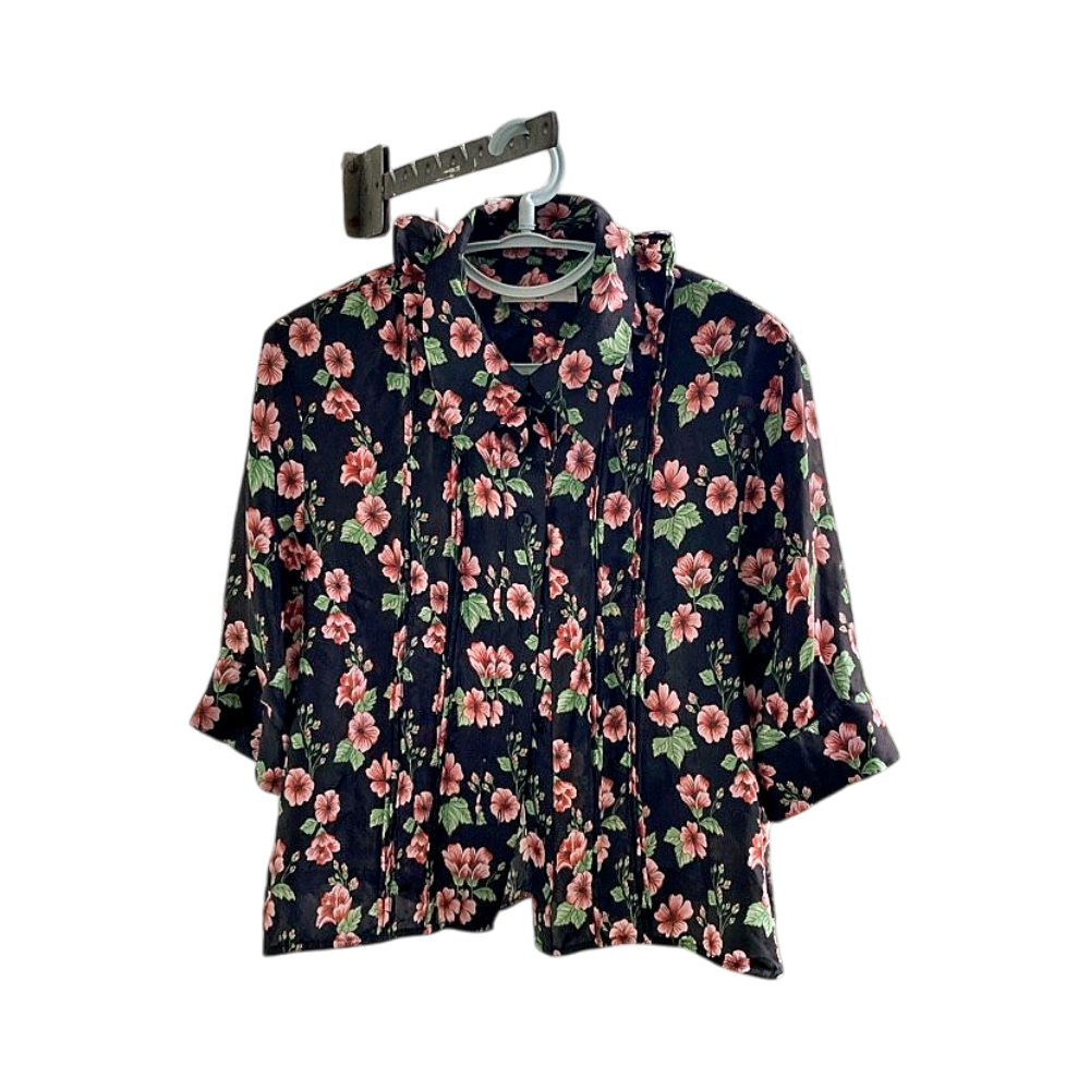 Naisten musta silkkipaita pinkeillä kukilla, koko 36. 100% silkkiä. Käytetty pari kertaa, kunto kuin uusi. Ovh. 150€