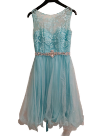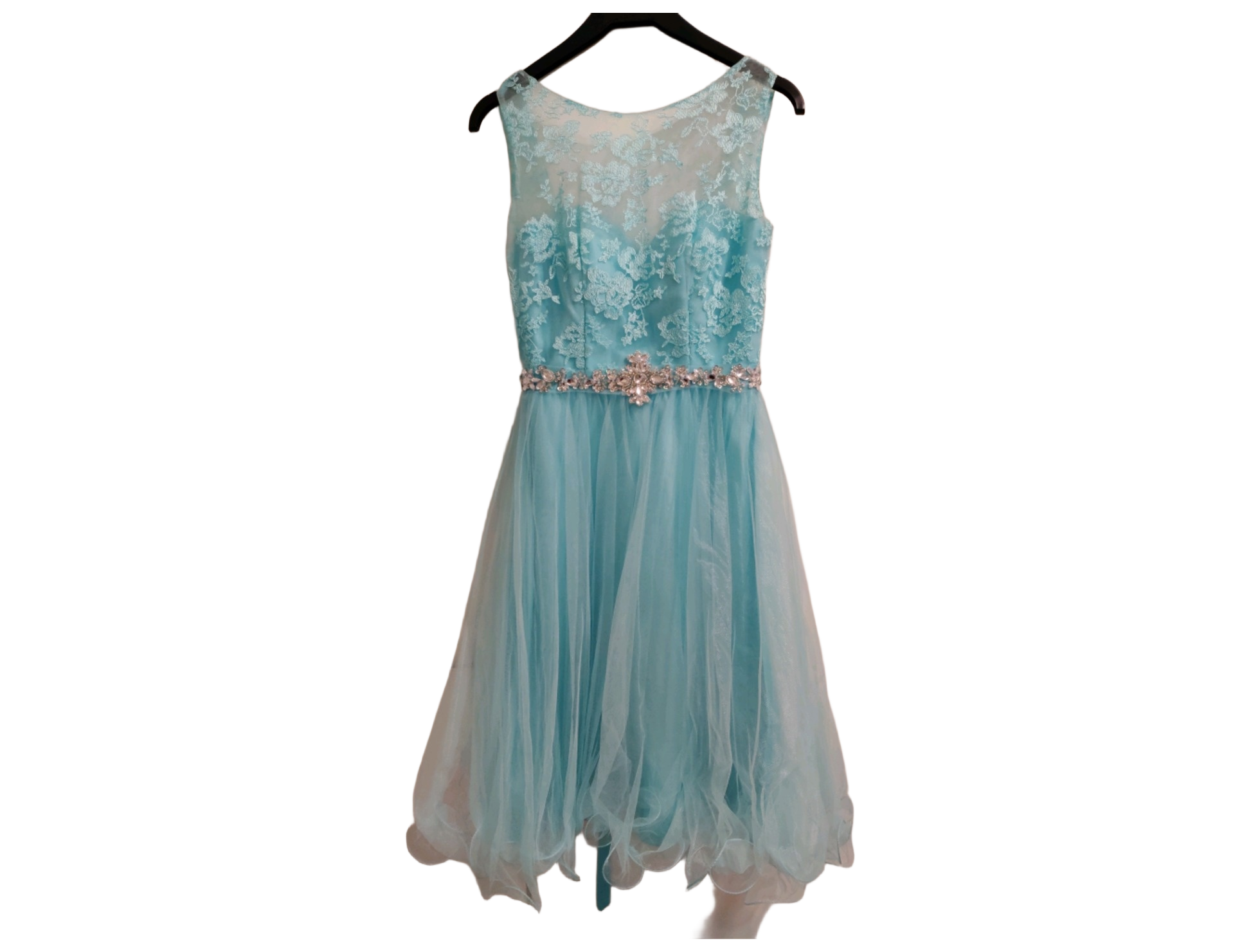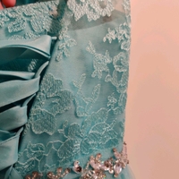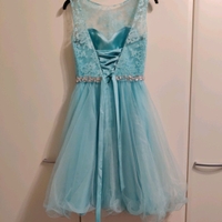 Haloselta ostettu juhlamekko, tasan kerran ollut päällä. Paljettien kiinnitystä vahvistettu ompelijalla. Kokolapussa lukee koko 30, mutta mekko menee n 32-36 kokoiselle nyörityksen ansiosta.