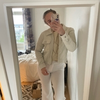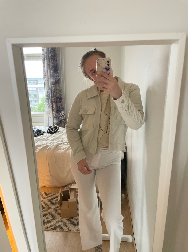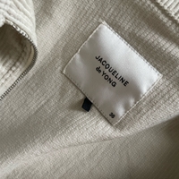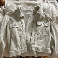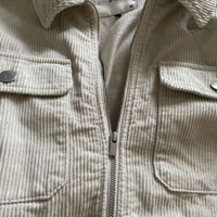 Beige corduroy takki vetoketjulla ja taskuilla.