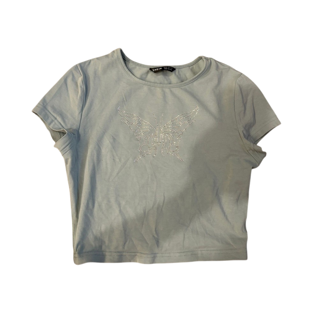 Lyhythihainen crop-top strassiperhossomisteella.