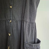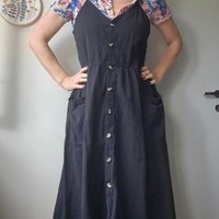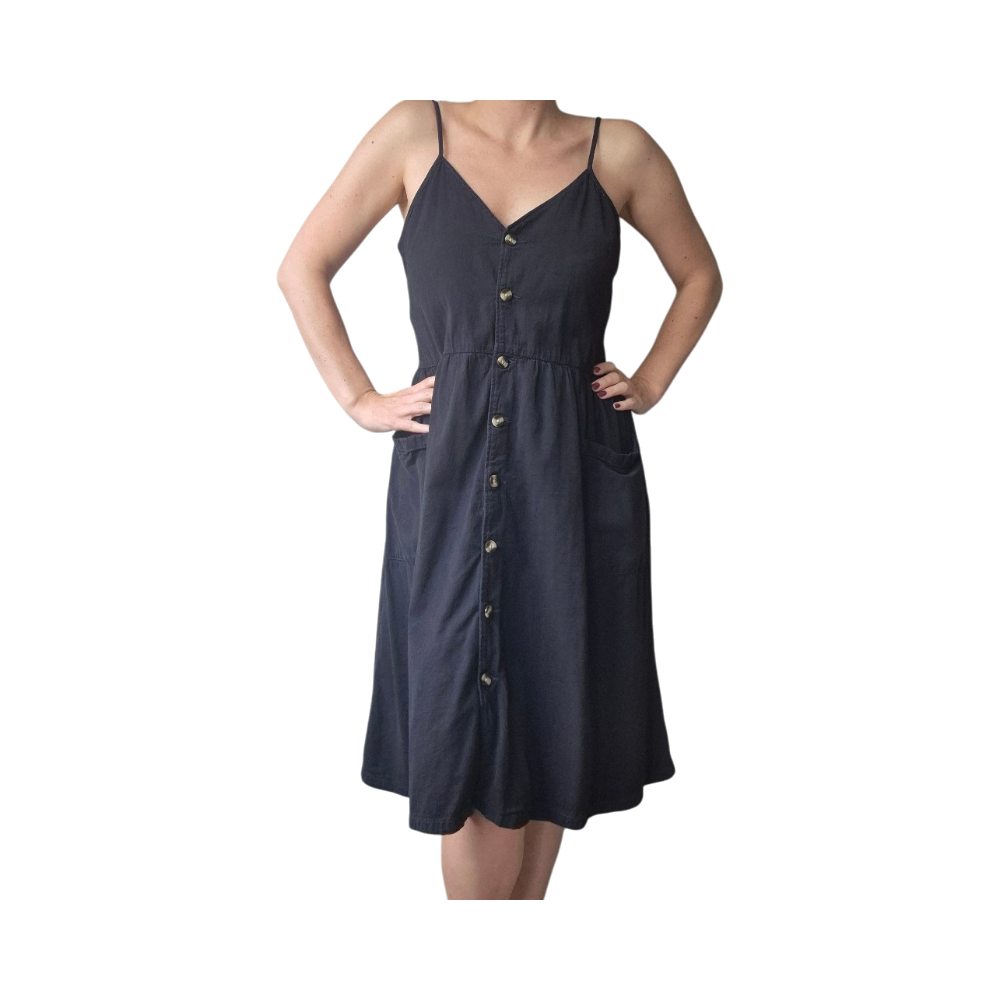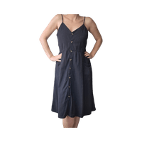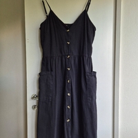 Cute blue dress with adjustable straps. Perfect to layer with a short sleeves or to wear by itself. It has pockets and the size is M although it runs oversized, I would say. Color is dark blue. Worn a couple of times only.