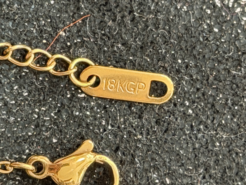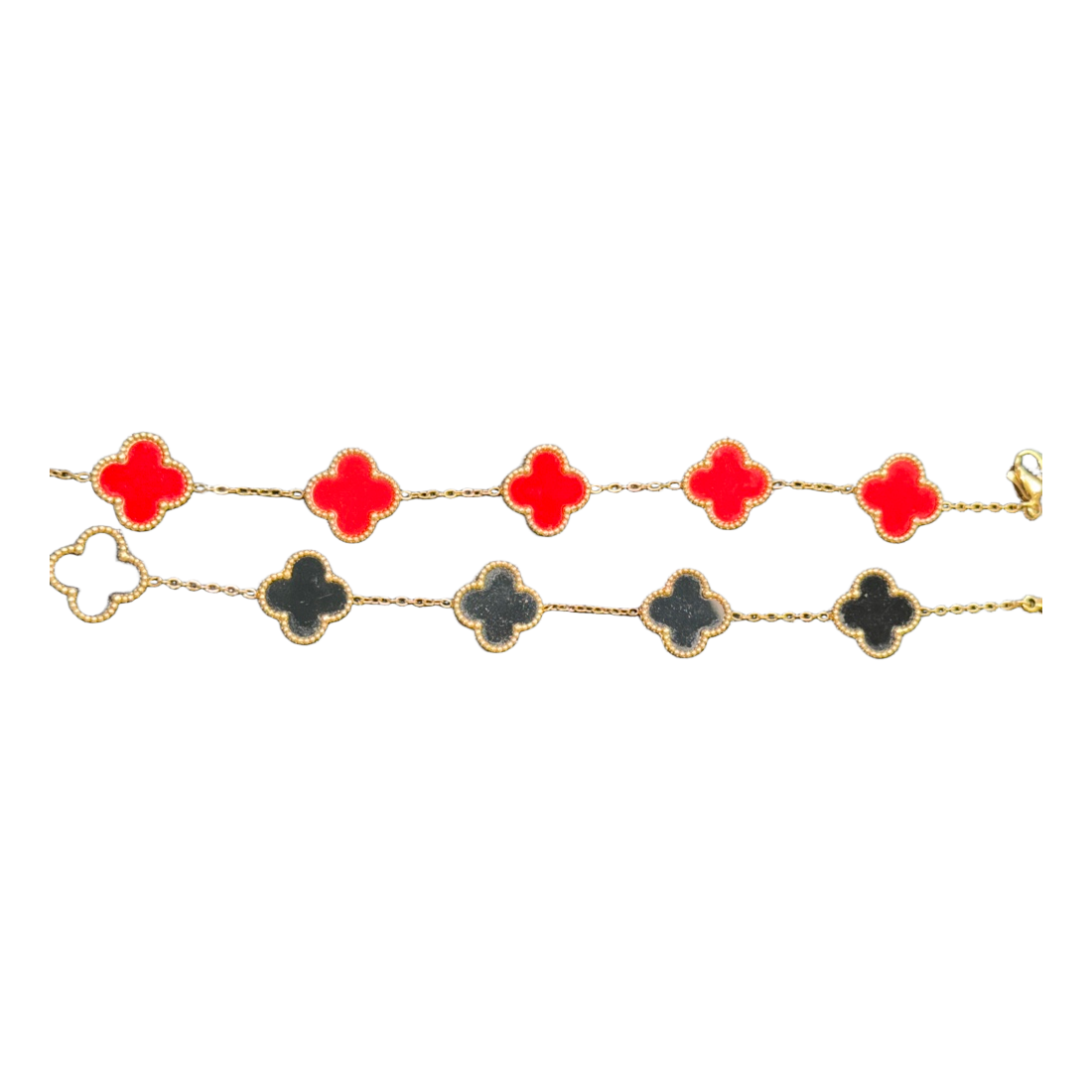 Two bracelets featuring red and black clover charms on a gold tone chain. Stamped 18KGP.