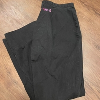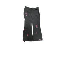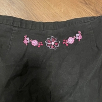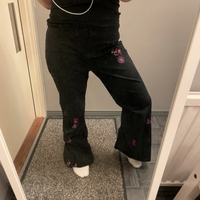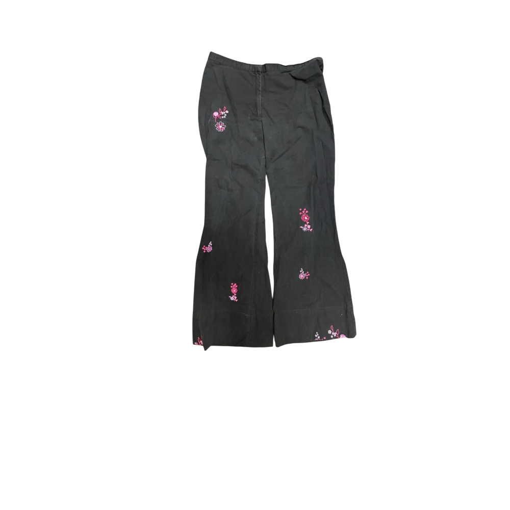 Mustat leveälahkeiset housut pinkeillä kukkakirjailuilla.