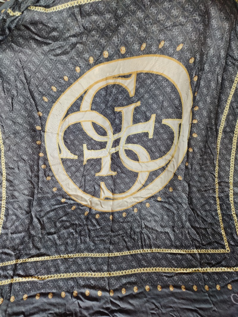 Guess huivi, noin 130 cm *130 cm. Joitain lankajuoksuja, näkyy kuvissa.