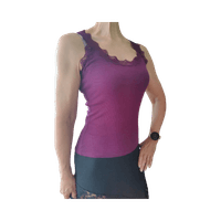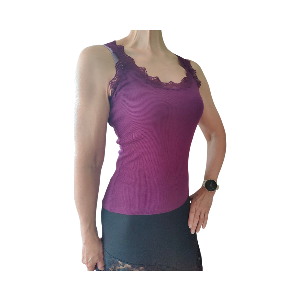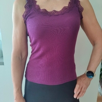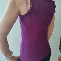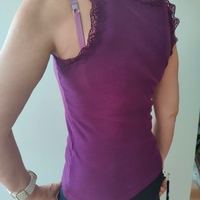 Joustava lila toppi, jossa pitsit pääntiessä ja hihan suussa. Merkistä, koosta ja materiaalista ei varmuutta. Koko vastaa S-kokoa.