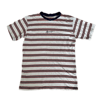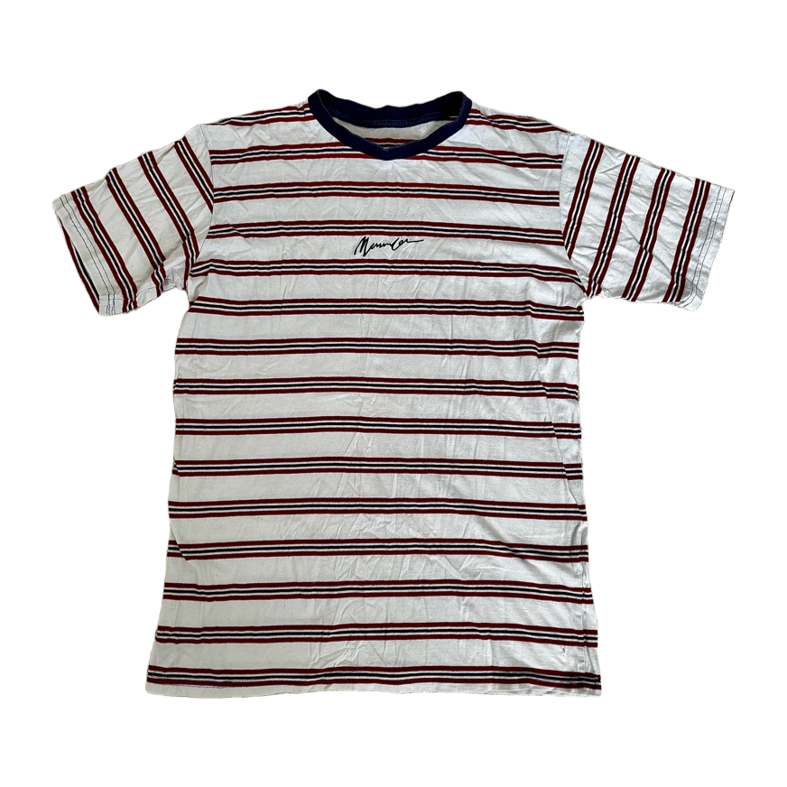 Mennace raidallinen t paita. Kokoa ei näy mutta uskoisin että olisi sopiva m kokoiselle. Helmassa on kaksi paikattua reikää.