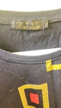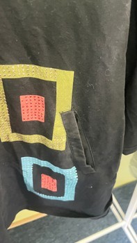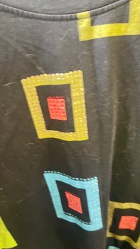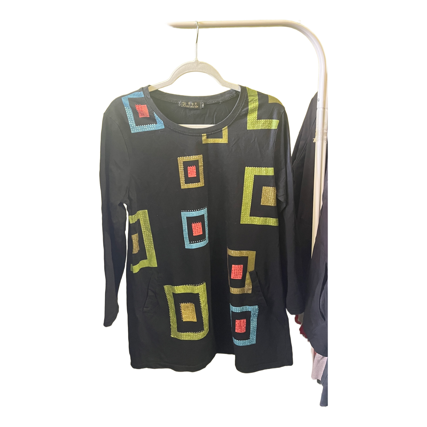Black long-sleeved top featuring square patterns in blue, green, and orange. Made of cotton and elastane. Size XL.