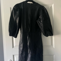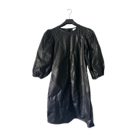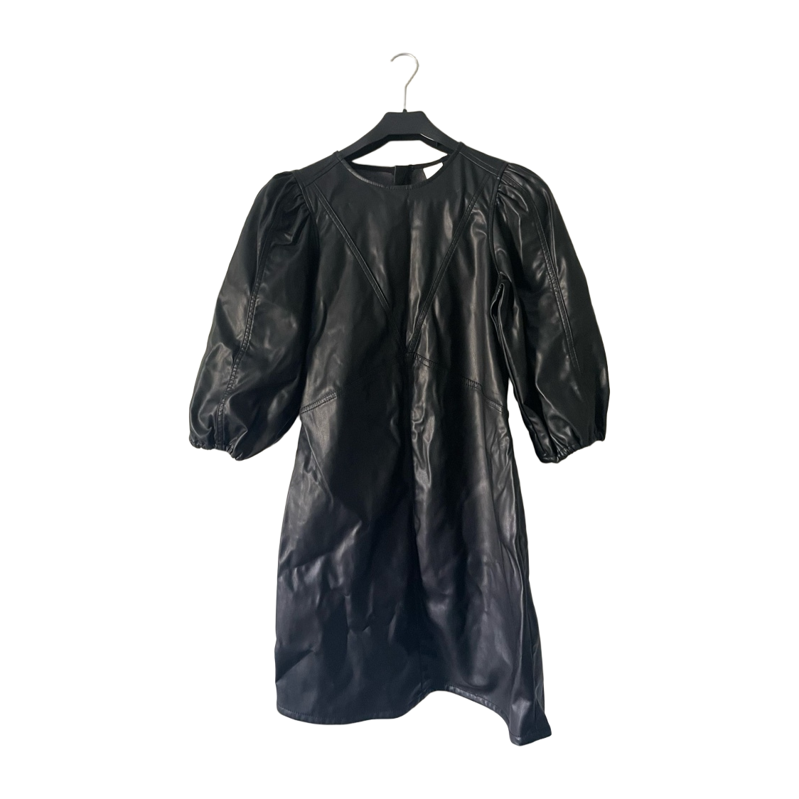 Naisten musta keinonahkainen mekko, pussihihat, vetoketju takana.