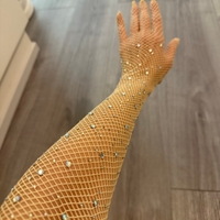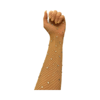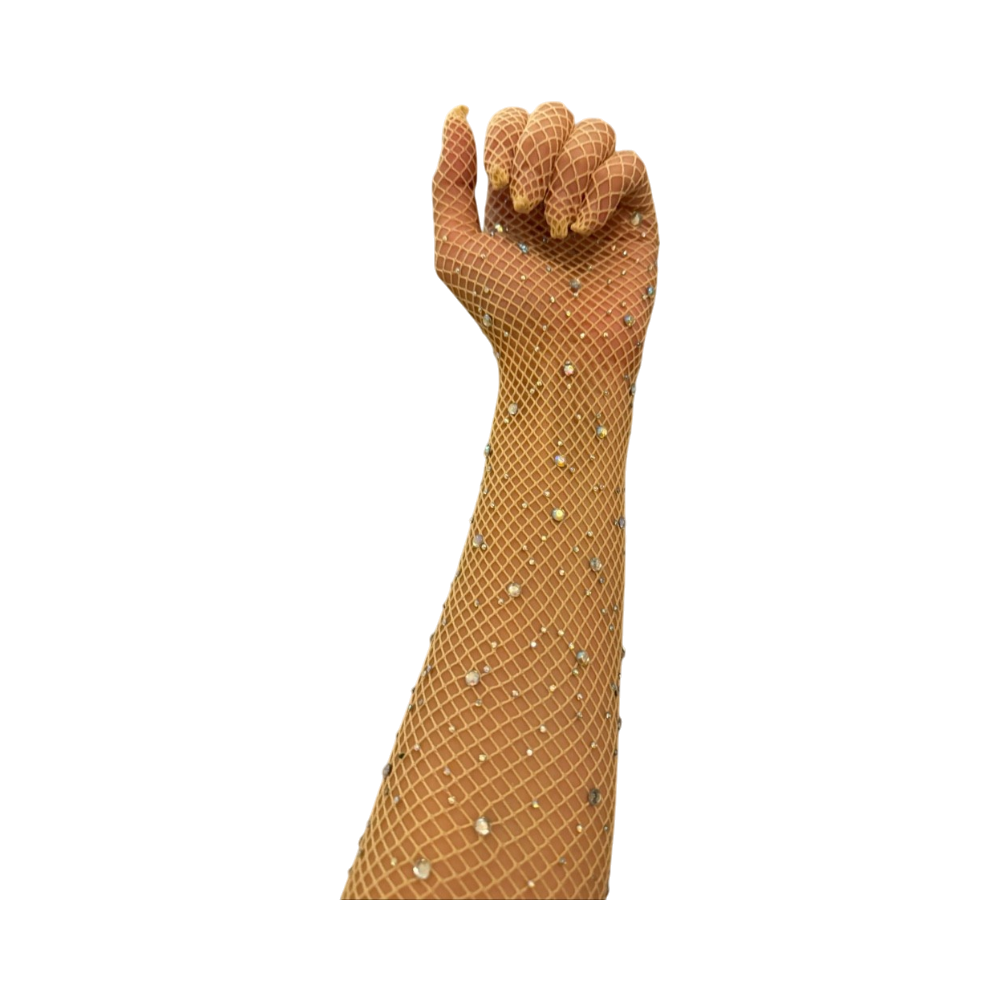 Long beige fishnet gloves with scattered rhinestones, elegant evening accessory.