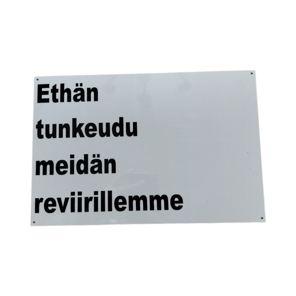 Valkoinen muovikyltti mustalla tekstillä, reijät kiinnitystä varten.