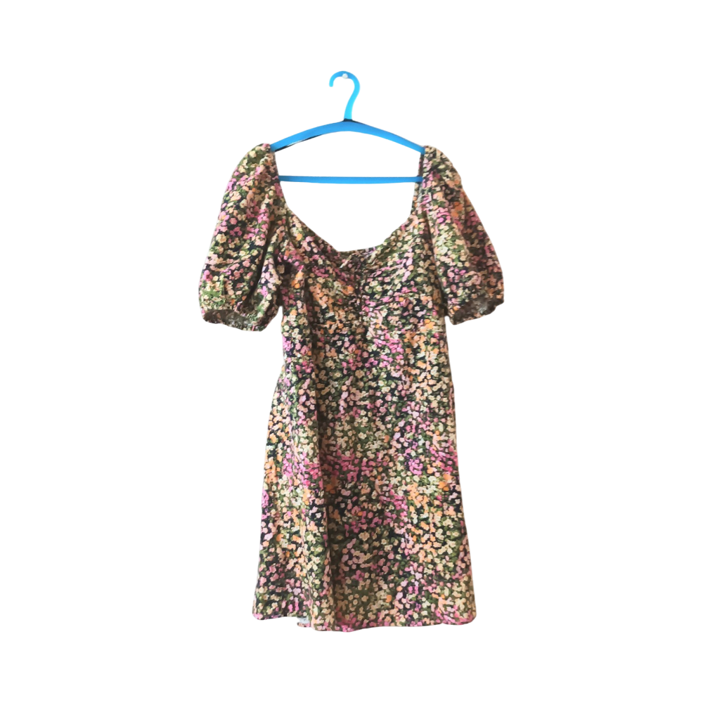 kukkamekko lyhyillä hihoilla.Puhvihihat. Keskiselässä leveä joustava kohta. Myös L koolle hyvä