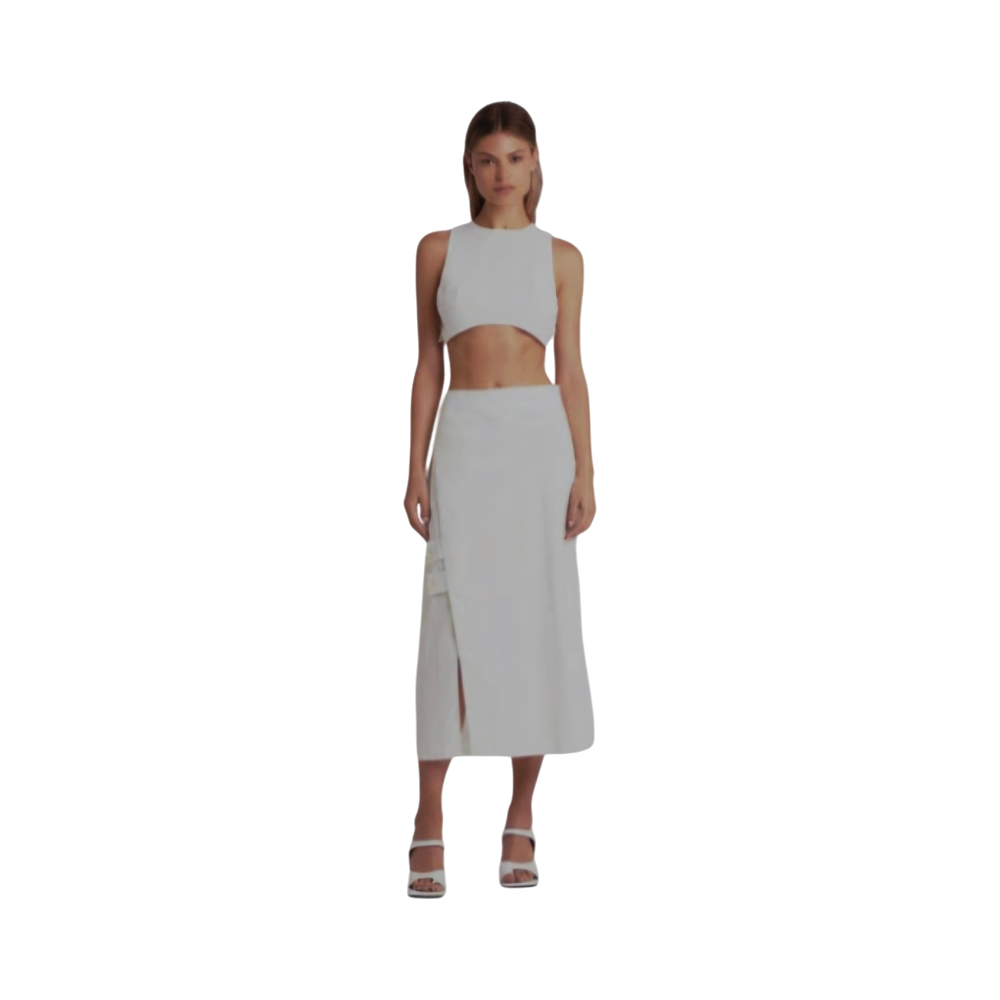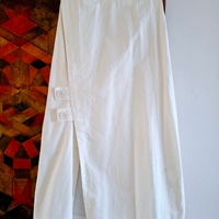 White high-quality midi linen skirt with asymmetric button closure on side.