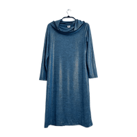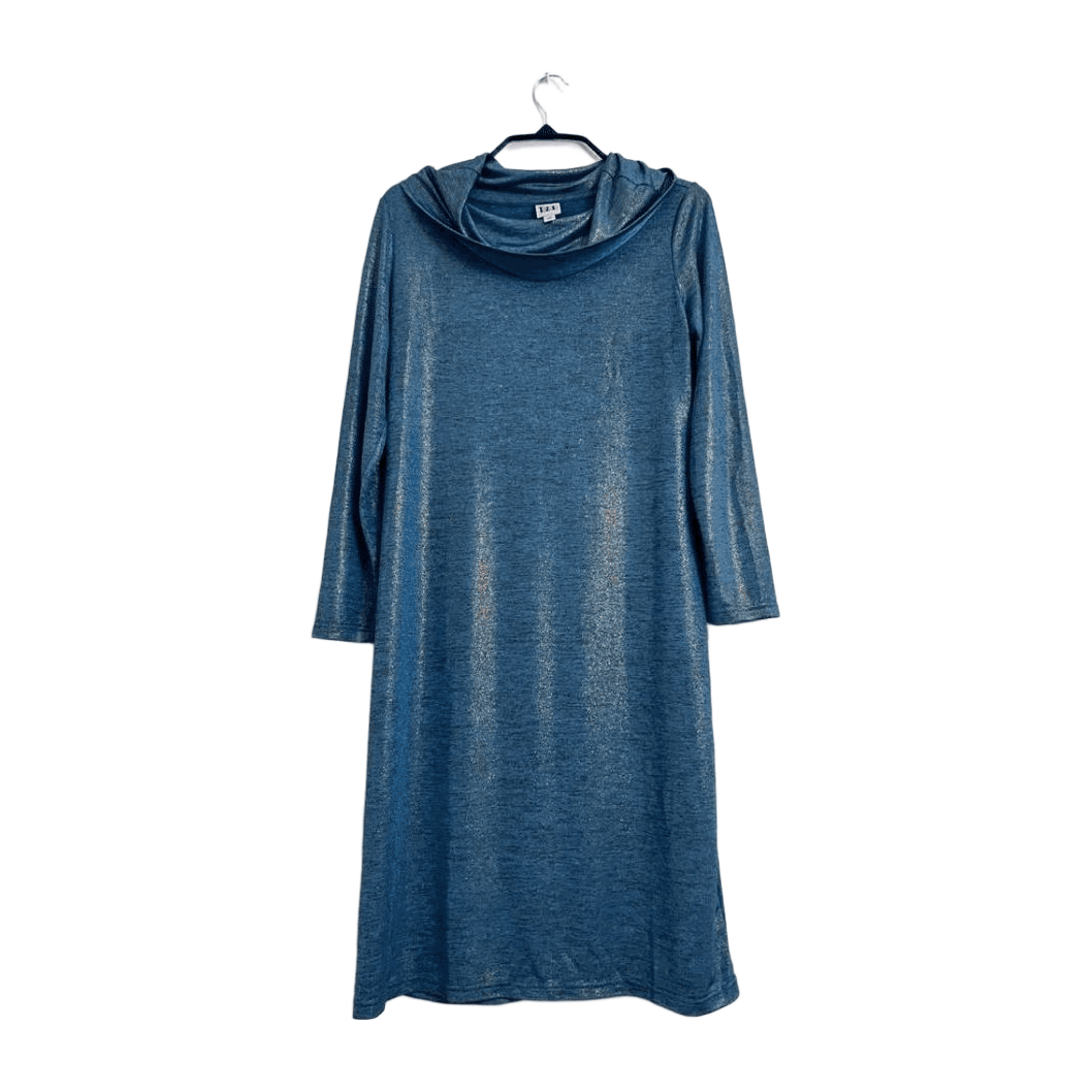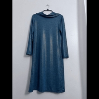 Tazzia-merkkinen pitkä mekko koko 40. Kangas kevyttä, hieman läpinäkyvää ja hyvin laskeutuvaa, väri kullanhohtoinen turkoosi. Pääntiellä pyöreä, korkea ja kauniisti laskeutuva kaulus. Suora malli. Mitat: kainalo-kainalo 52 cm, pituus olka-helma 105 cm. Kunto kuin uusi!