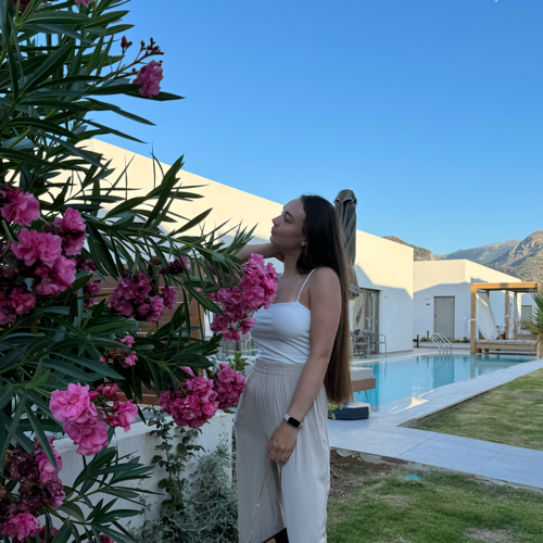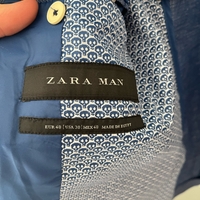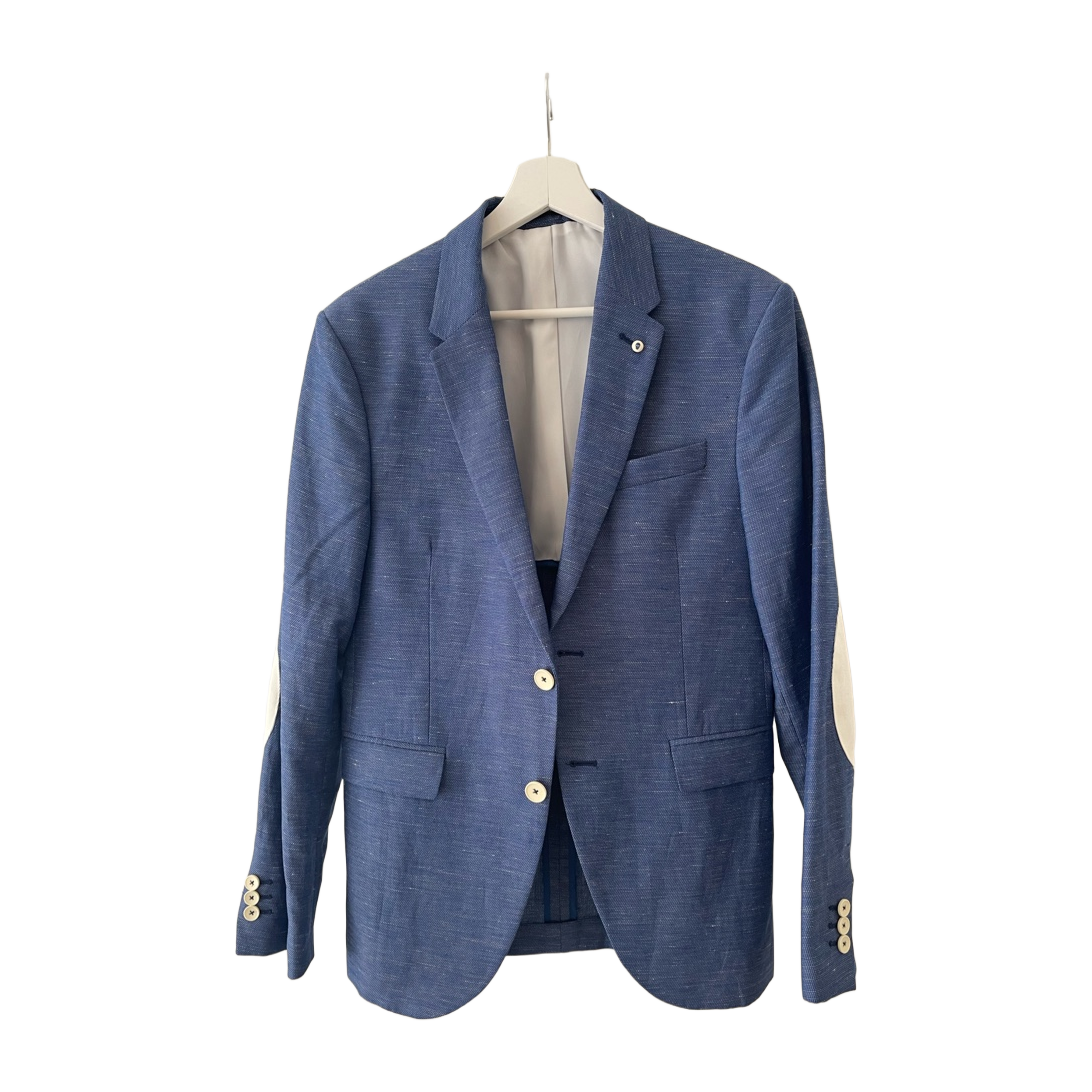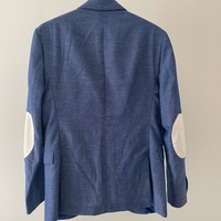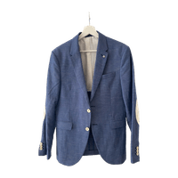 Sininen bleiseri valkoisilla kyynärpäillä.