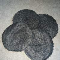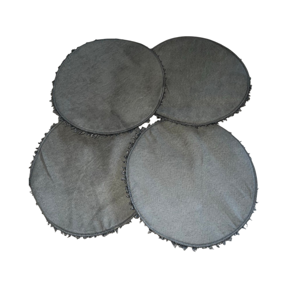 Neljä harmaata pyöreää pehmustetta tuoleille.