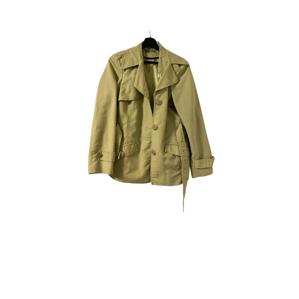 Vihreä ”y2k” tyylinen trenssimallinen takki, vyö ja napit.