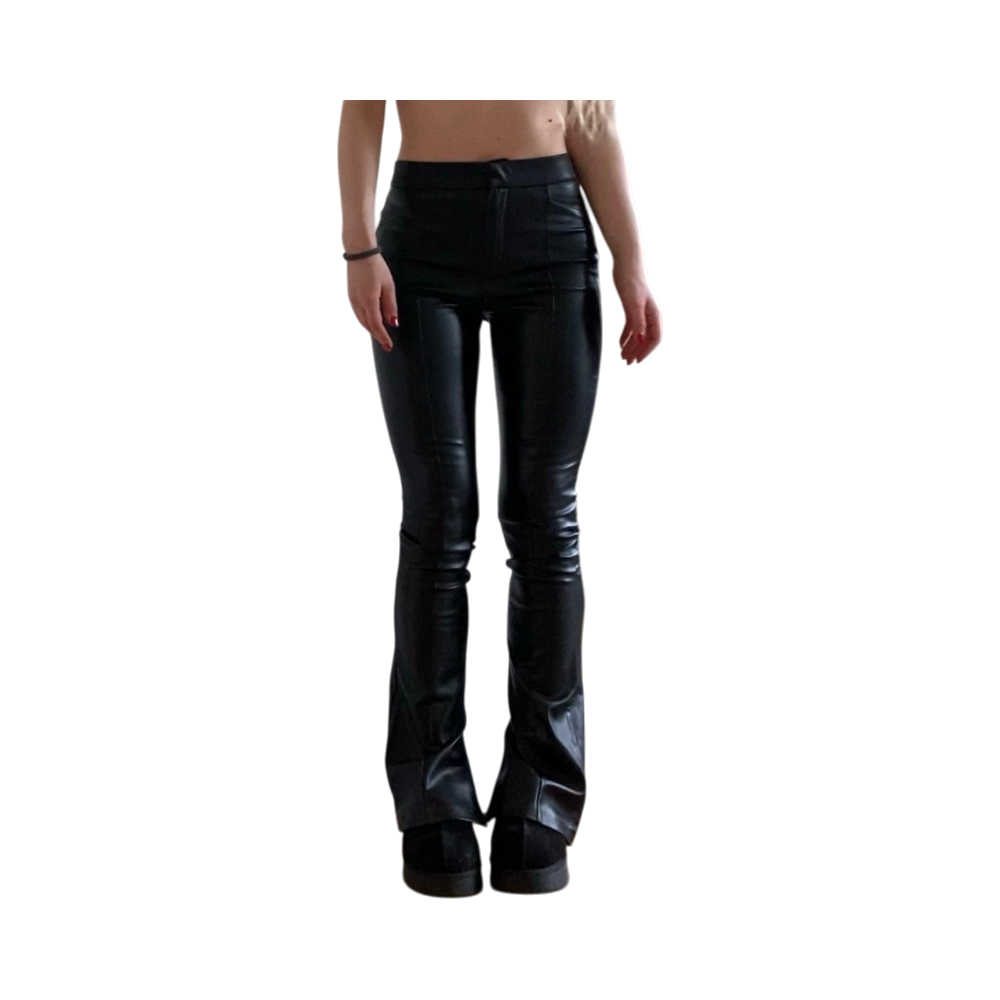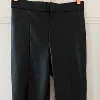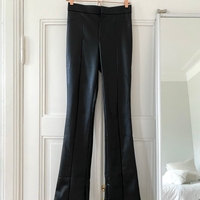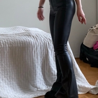 Musta flared-housu, keinonahkaa. edessä ja punttien sisäpuolla on vetskari. Käytetty kaksi kertaa, tosi hyvä kunto. Tosi pitkät lahkeet!
