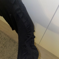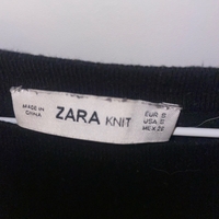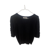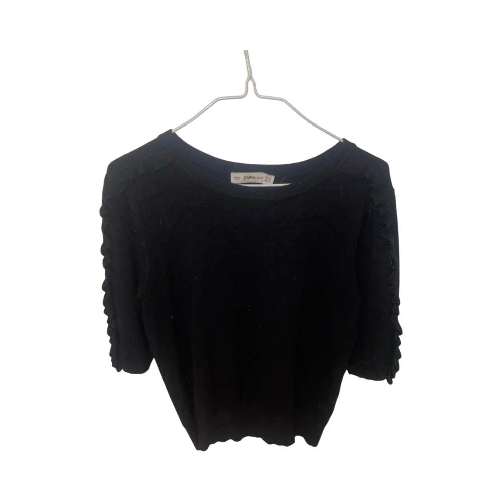 Lyhythihainen musta neule, röyhelödetaljit hihoissa. S kokoinen, mutta istuu hyvin myös XS kokoiselle. Poistan karvat ennen postitusta