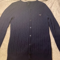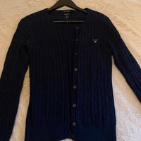 Gantin naisten tummansininen neuletakki, koko S. Ei montaa kertaa ole ollut käytössä, joten erittäin hyväkuntoinen ja siisti. Laadukas ja ajaton malli, sopii hyvin niin arkeen kuin siistimpäänkin käyttöön. Hinta uutena 149.90€.