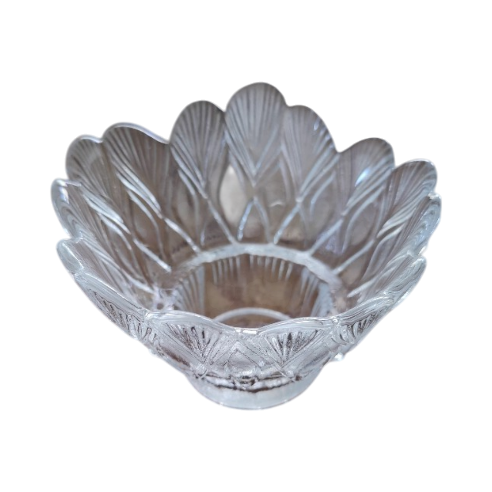 Pieni koristeellinen lasikulho, kukkakuvioitu, käytettynä hyväkuntoinen. Sopii tuikku kynttilä. Pakkaan hyvin kuplamuoviin.