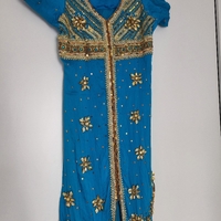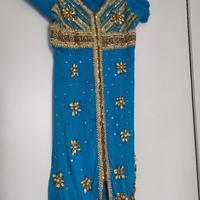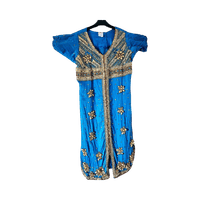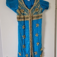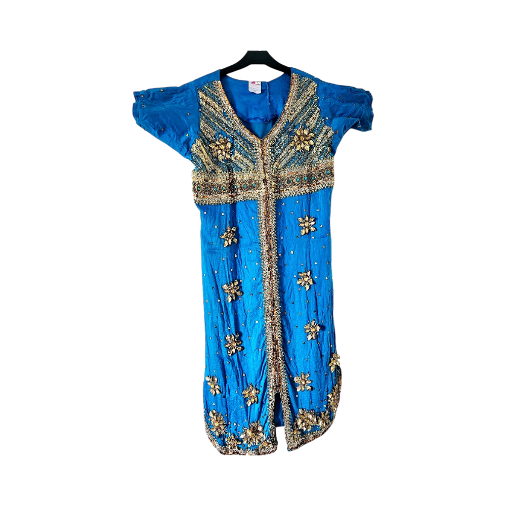 Turkoosi mekko kultaisilla koristeilla ja helmillä. Intialainen salwar kameez. Puolipitkä mekko/tunika. Kunto hyvä.