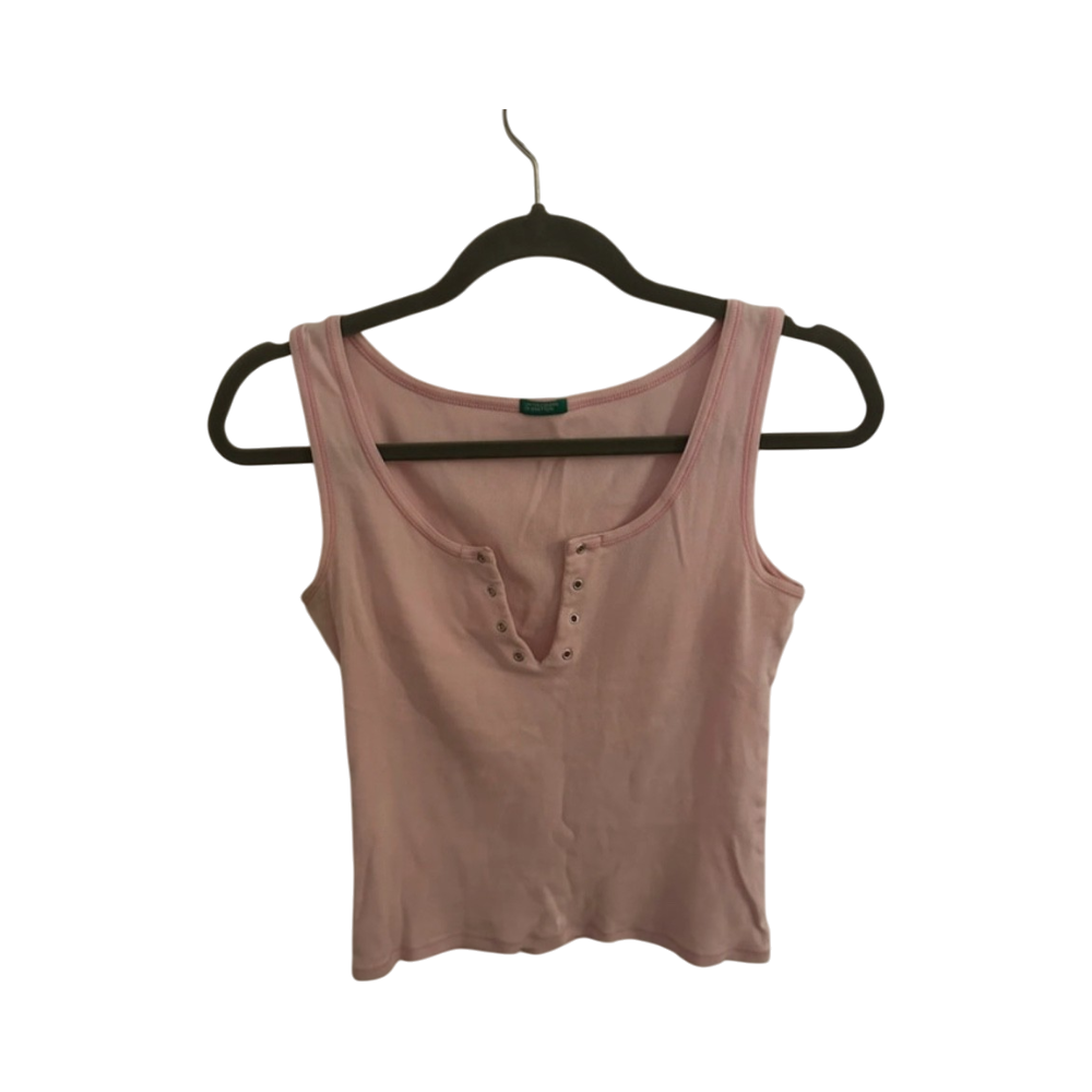 Soft pink sleeveless tank with eyelet V-neck detail.