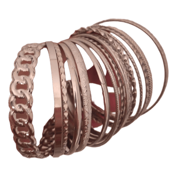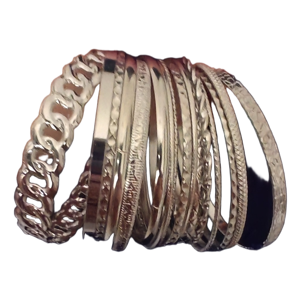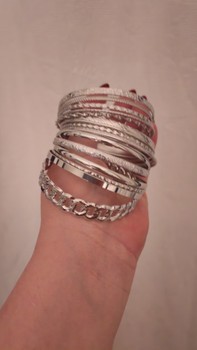 Hopeanvärisiä rannekoruja useita erikokoisia ja -tyylisiä.