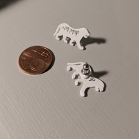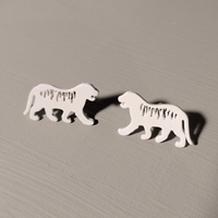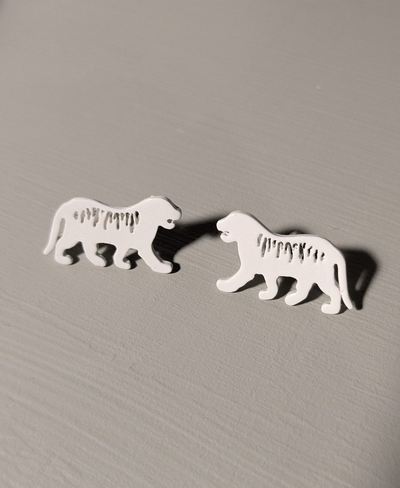 Pienet valkoiset tiikerinmuotoiset nappikorvakorut. 5 sentin kolikko kokoesimerkkinä. Kevyttä, maalattua tai pinnoitettua metallia.