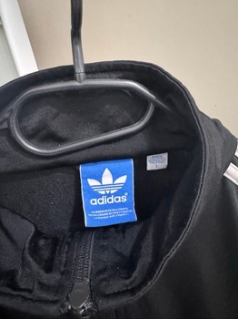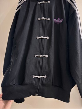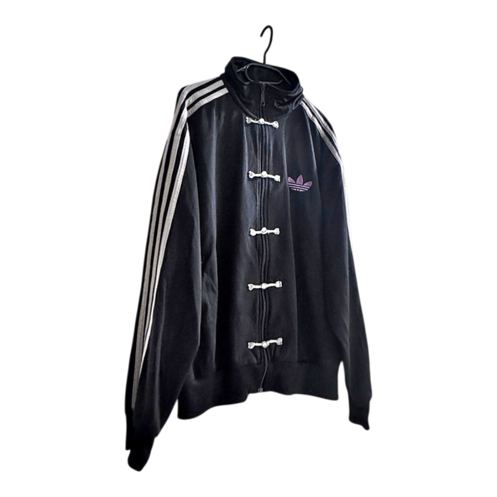 Black Adidas track jacket with white stripes on the sleeves. Features a high collar and unique Chinese frog closures.