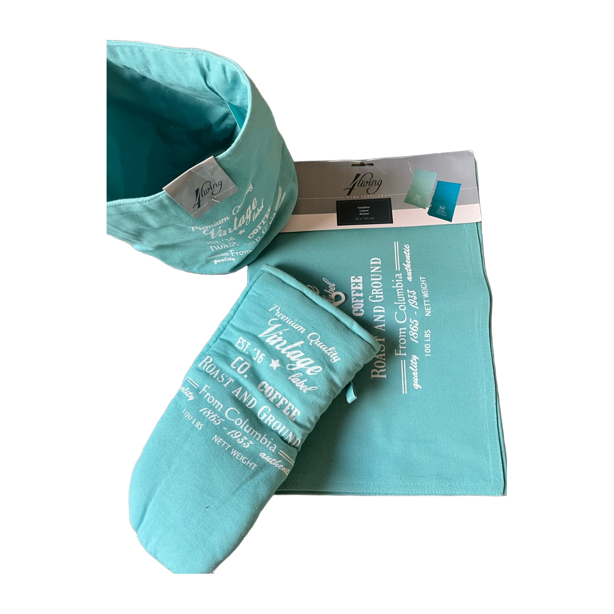 Keittiötektiilisetti, jossa patakinnas, kori ja kaitaliina. Uudet