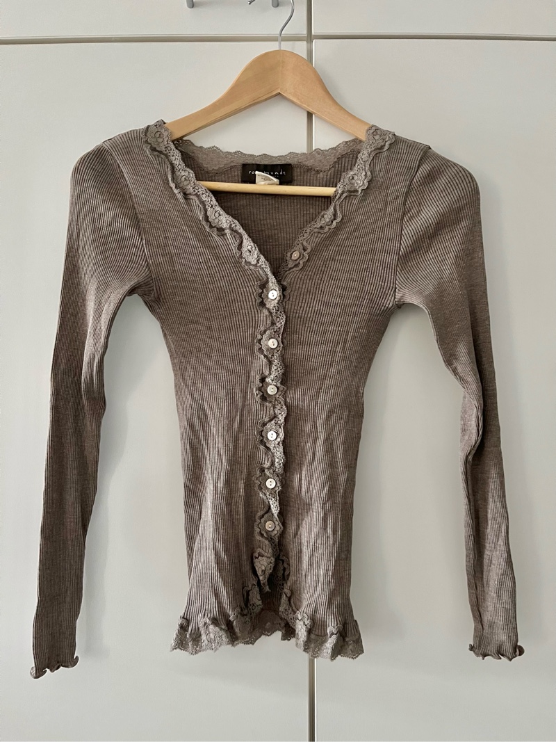 Rosemunden neule koossa S. 70% silkkiä ja 30% puuvillaa. Käytetty kahdesti eli hyvin uutta vastaavassa kunnossa. Kangas hyvin joustavaa mutta ei mene isommalle, pienemmälle toki