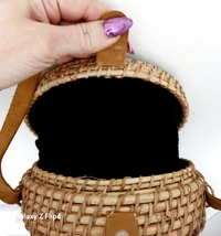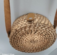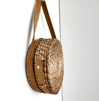Pyöreä olkainen olkalaukku luonnonväristä materiaalia.