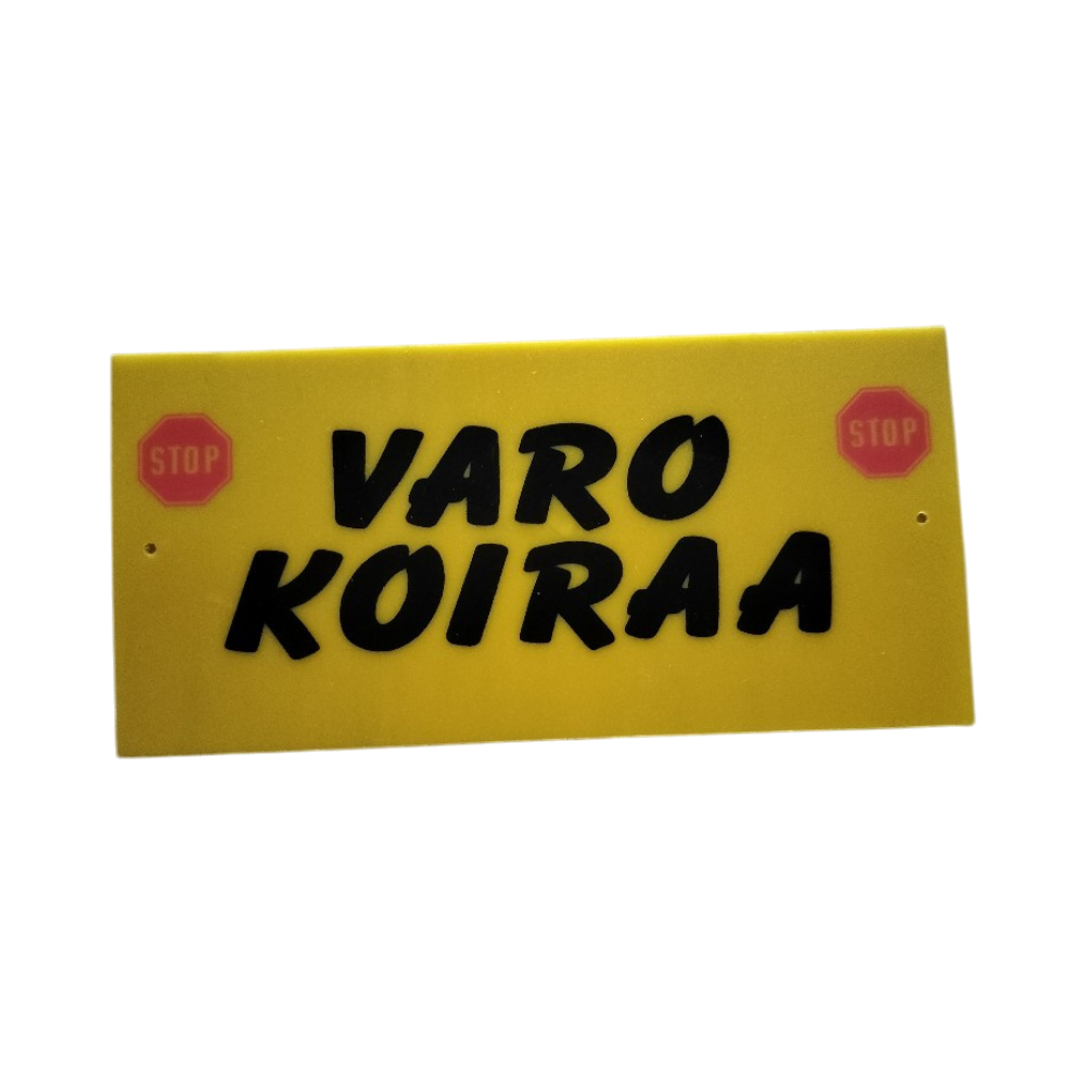 Keltainen varoituskyltti 'Varo koiraa', äänetön ja selkeä.