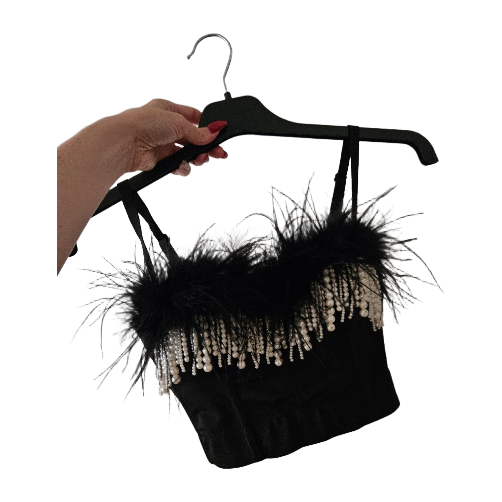 Tyylikäs musta toppi helmillä ja höyhenillä.