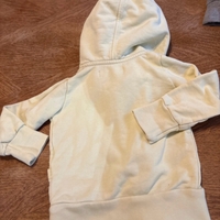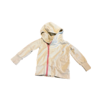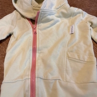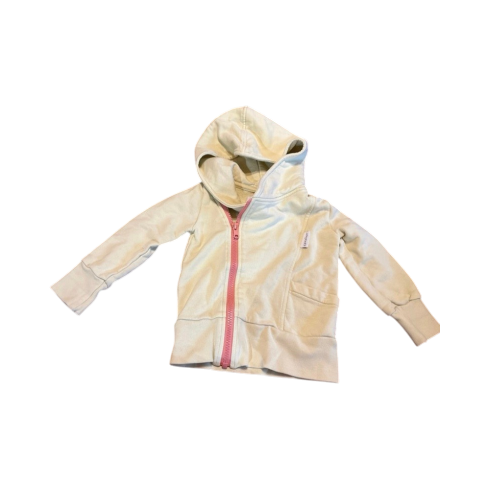Vaahtoinen vaaleabeige vauvan huppari, vaaleankeltainen vetoketju.